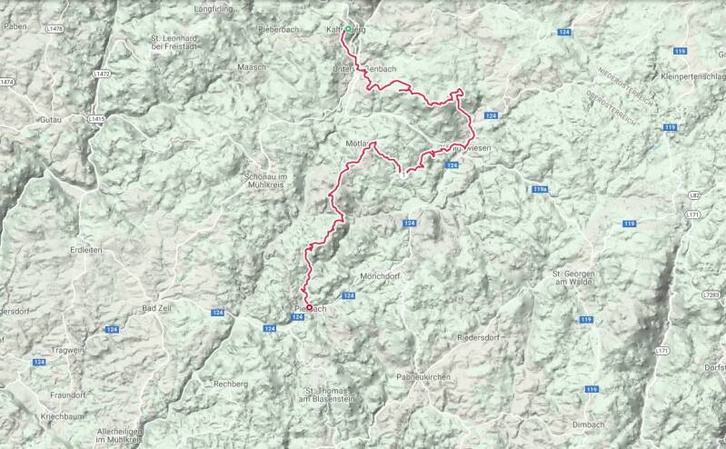 Am Ende eines Schotterweges wartet, kurz vor den Toren der Ruine, dann das Schutzhaus Ruttenstein. Dort lege ich erneut eine Pause ein und genieße den Anblick der Ruine. Von nun an ändert sich die Charakteristik des Weges ein wenig. Man bewegt sich nun durch klamm artiges Gebiet. Über Pfade geht es stetig bergab. Nach dem Abstieg vorbei am Bodenberg erreicht man zwar wieder eine Fahrbahn, welcher man auch weiter in den Süden folgt. Begleitet wird man nun von der großen Naarn. Später marschiert man für einen kurzen Abschnitt an einem angelegten Felsweg neben dem Bach, ehe man zurück zu Fahrbahn gelangt. Dieser folgt man nun weiter durch das Naarntal, bis man schließlich direkt vor der Kirche in Pierbach steht. Etappe geschafft!