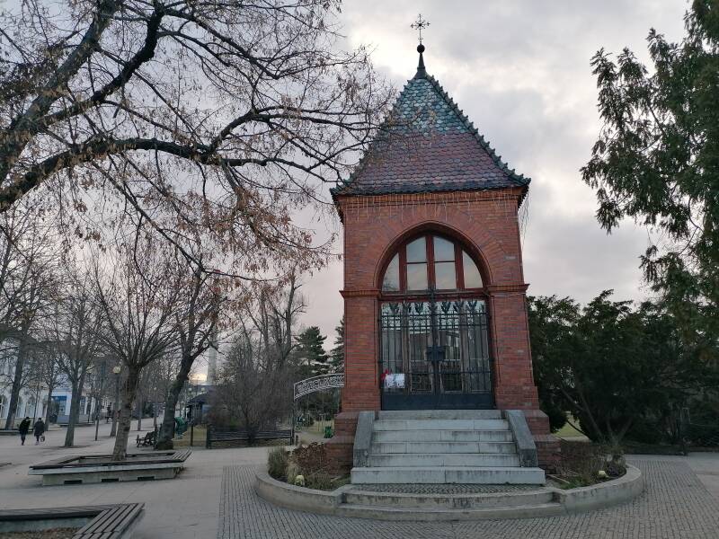 Nach dem Übersetzten der Straße Stromořadní betreten wir den örtlichen Stadtpark, an dem am nordwestlichstem Ende die Kaple sv. Rocha zu finden ist. Diese Kapelle erfreut sich großer Beliebtheit in der Stadt. Ihr Äusseres gleicht einer Skulptur und ist ein kleines, aber markantes Bauwerk. An der Ostseite des Parks finden wir weitere Kunstwerke aus Beton an der modernen Parque Břeclav, der Fußgängerzone von Lundenburg.