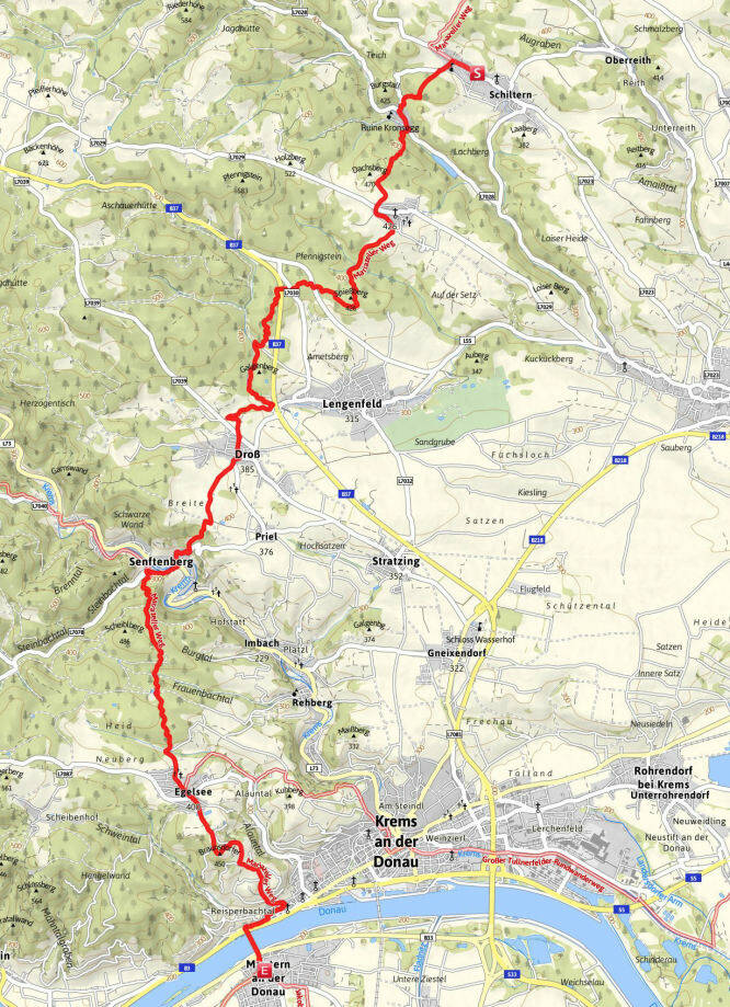 Wir starten unsere Tour bei herrlichem Wanderwetter. Zunächst marschieren wir die Straße hinauf zum Schloss Schiltern. Hier folgen wir dann der Kronsegger Straße südlich bis zum Schlussparkplatz. Hier verlassen wir Schiltern und wandern durch ein kleines Waldstück hinab nach Kronsegg, wo auch schon die Ruine Kronsegg auf uns wartet. Nachdem wir dieses kleine Tal verlassen, folgt der erste Anstieg. Und der hat es gleich in sich. Der Waldsteig führt hinauf auf den Dachsberg. Gleich darauf folgt die kleine Ortschaft Mittelberg. Vor den Augen des Pfenningsteins geht es nun weiter durch ein schönes Erholungsgebiet, durch den Wald, um den Spießberg herum. Danach überqueren wir die Kremser Bundesstraße und folgen nun dem Pfad südlich entlang der B37 bis zum Galgenberg. Dort erreichen wir den westlichsten Zipfel von Lengenfeld, marschieren jedoch über den Schäferhof nach Droß.