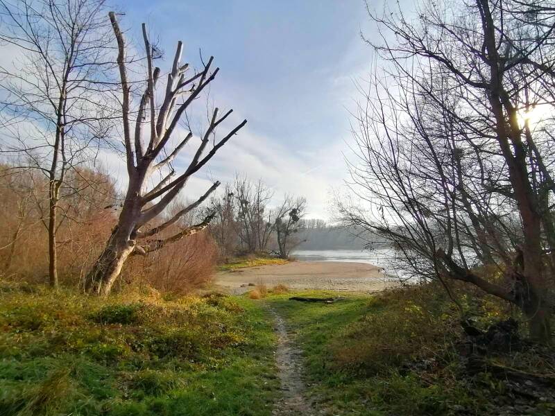 Wir bleiben auf der Forststraße und tauchen tiefer in das Auengebiet ein, indem wir durch eine lange gerade Allee spazieren. Nach einigen Metern gelangen wir an eine gröbere Linkskurve, wobei ein weiterer Forstweg rechts über eine kleine Holzbrücke abfällt. Dort biegen wir ab und steigen über die Brücke. Wenige Augenblicke später erreichen wir auch schon den Marchegger Schutzdamm, auch Donaudamm genannt. Auf ihm befindet sich der asphaltierte Donauradweg und man kann in beide Richtungen kilometerweit in die Ferne blicken. Wir überqueren den Damm und setzen den Weg auf einem Karrenweg fort. Dieser führt uns, an einem länglichen Tümpel mit Schilf vorbei, direkt zum nördlichen Ufer der Donau. Dort treffen wir auch auf den Ostöstererichischen Grenzlandweg 07 und dem Orther Uferhausweg. Wenig später stehen wir auch schon vor den "Orther Inseln".